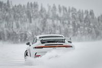 Een Porsche 992 GT3 in volledige drift op een bevroren meer in Zweeds Lapland. Ein Porsche 992 GT3 im vollen Drift auf einem zugefrorenen See im schwedischen Lappland.