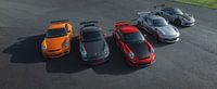 A spectacular Porsche line up shot in panoramic view including the 997.1 GT3 RS, 997.2 GT3 RS, 997 GT2 RS, 991 GT3 RS and 991.2 GT3 RS Weissach.