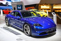 Porsche Taycan Turbo volledig elektrische luxeauto. De Taycan is uitgerust met een batterij-elektrische aandrijving van permanente-magnetische synchrone motoren op de assen, waardoor de auto vierwielaandrijving heeft. Hoewel de auto Taycan Turbo heet, is hij niet voorzien van een Turbo.