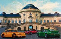 Realistic acrylic painting of Three Porsches in front of Solitude Castle in Stuttgart, painted by the dutch fine artist Paul Meijering - the original painting is 120 x 80 cm and available for purchase,