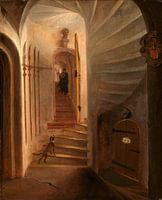 Portaal van een trappentoren, met een man die de trap afloopt: vermoedelijk het moment voor de moord op Willem de Zwijger in de Ptinsenhof, Delft, Egbert Lievensz. van der Poel.