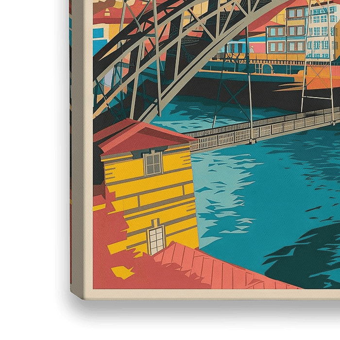 Een majestueuze stalen boog zwaait over het glinsterende water, terwijl kleurrijke gebouwen tot leven komen op de oevers. De zachte, warme tinten van de lucht geven het tafereel een nostalgische sfeer die doet denken aan de levendige geschiedenis van Porto. Een uitnodigende flair die de ziel van deze unieke stad vangt.