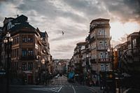 De Portugese stad Porto bij een dramatische zonsondergang. De regenwolken in de verte met de zon er doorheen, en de vogel die net door de gebouwen heen vloog gaf een prachtig beeld. Heerlijke stad om door heen te wandelen.