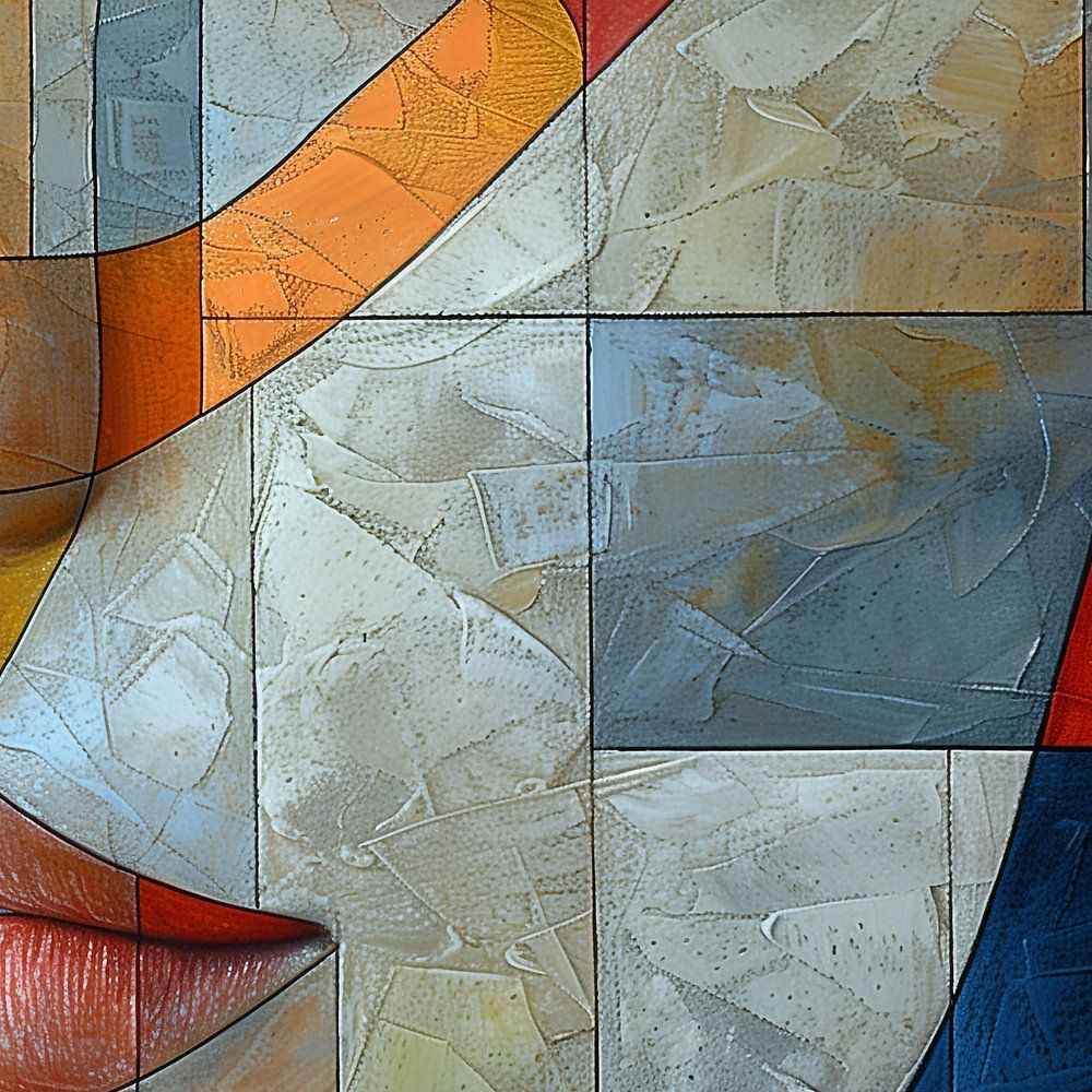 Het gezicht van de vrouw, zorgvuldig gedetailleerd en realistisch weergegeven, contrasteert sterk met de abstracte, geometrische vormen die het canvas fragmenteren. Deze techniek creëert een boeiende visuele spanning en nodigt de kijker uit om zowel het geheel als de afzonderlijke delen te onderzoeken. Elk segment lijkt een eigen verhaal te vertellen, terwijl het toch bijdraagt aan de harmonie en integriteit van het portret als geheel.