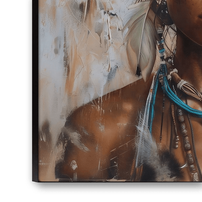 Dit portret van een Indiaanse vrouw met veren in haar haar is op die manier letterlijk een echte muurtooi! De kleuren, de blik in haar ogen en de fraaie achtergrond maken dit tot een pronkstuk aan uw muur! Dit werk is gegenereerd d.m.v kunstmatige intelligentie en wel met Midjourney. Ik wens de koper er veel plezier mee!