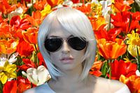 Fotomontage eines Tulpenfotos mit einer Schaufensterpuppe