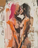 "Dans van Intimiteit in Abstract Expressionisme," is een digitaal schilderij van René van den Berg. Twee figuren worden verbeeld met vloeiende, dynamische verfstreken die hun liefdevolle verbondenheid tonen. Warme tinten van koraalroze en aardse bruintinten gaan harmonieus samen tegen een achtergrond van neutrale wit- en grijstinten, wat de figuren centraal stelt. De emotionele uitdrukking wordt versterkt door de ruwe, expressieve penseelvoering, kenmerkend voor het abstract expressionisme, waarbij de nadruk ligt op spontane, krachtige uitdrukkingsvormen. Dit werk zou "Verbintenis in Verf" kunnen heten, wat de essentie van de afbeelding en de kunststijl vangt.