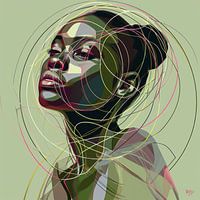 "Een digitaal schilderij gecreëerd door René van den Berg, getiteld 'Afrikaanse Vrouw in Harmonie'. De hoofdpersoon is een Afrikaanse vrouw, afgebeeld in een dynamische en levendige houding. Haar gelaatstrekken zijn zacht en uitdrukkelijk, waardoor een gevoel van rust en kracht uitstraalt. De vrouw is gehuld in kleding die speelt met een palet van groen, grijs, en zacht roze tinten, wat een gevoel van vrede en natuurlijke schoonheid oproept. Deze kleuren mengen harmonieus samen, terwijl ze ook contrasteren om de vrouw uit te lichten tegen de abstracte achtergrond. De achtergrond zelf bestaat uit speelse vormen en lijnen, die een gevoel van beweging en energie toevoegen aan het stuk. Het gebruik van schaduw en licht in het digitale medium brengt diepte en textuur in het beeld, waardoor een bijna tastbare ervaring voor de kijker ontstaat. Dit kunstwerk is een viering van de schoonheid en kracht van de Afrikaanse vrouw, vastgelegd in een moderne, abstracte stijl."