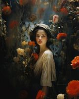 Portret met de titel "All I need is nature". Een meisje in klassieke kleding, omringd door bloemen in een sfeervolle omgeving. Gebaseerd op de oude meesters, maar met een moderne twist. Een bijzonder werk voor aan je muur!