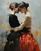 Portret "Beautiful love". Dit portret toont de liefde tussen twee jonge vrouwen in een veld vol wilde bloemen. Warme kleurtinten gecombineerd met zachtere tinten geven het geheel een serene en poëtische sfeer.