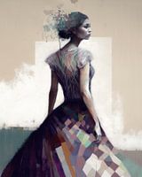 Geïllustreerd portret "Color me purple" in voornamelijk paarstinten. getekende vrouw, op de rug gezien, welke een jurk draagt met gekleurde geometrische vormen in pastelkleuren.