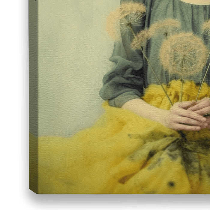 Portret "Dandelions". Een prachtig zacht en poëtisch portret van een jonge vrouw met gesloten ogen en op de voorgrond paardebloemen. In geel en zacht groen.