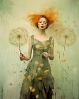 Portret "Dandelions". Een prachtig zacht en poëtisch portret van een jonge vrouw met gesloten ogen en op de voorgrond paardebloemen. In oranje en zacht groen.
