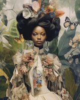 Portret "Garden of Eden". Bijzonder portret van een jonge vrouw in prachtige kleding, middenin de natuur, omringd door planten en vlinders.