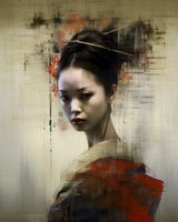 Portret "Geisha in rode tinten". Portret in mixed media stijl van een jonge vrouw in kimono. Woonstijl Japandi, Oosters.