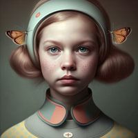 Portret "Girl with butterflies". Meisje met vlinders. Zorgvuldig samengesteld in pastelkleuren, digital art. Advies materiaalkeuze: artframe, acrylglas of dibond. Op deze materialen komt dit werk het best tot haar recht.