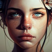 Portret "I see you", digital art. Close up portret van een meisje met helder blauwe ogen.