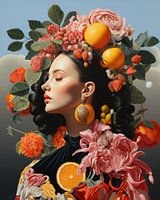 Portret: Just give me fruits and flowers". Bijzonder kleurrijk werk, dit is een echte blikvanger in je interieur! Het us een mix tussen een portret, bloemen en een fruitmand ;-) Kies zelf het formaat en materiaal!