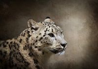 Close-up portret foto van een sneeuwluipaard verwerkt op een fine art achtergrond in de kleur bruin met mooie structuur en lichtval.
