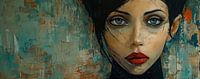 Portret | Mystic Gaze - Dit vrouwen schilderij toont het gezicht van een jonge vrouw dat op een adembenemende manier centraal staat tegen een abstracte achtergrond. De vrouw heeft grote, uitdrukkingsvolle turquoise ogen, volle rode lippen en een vlekkeloze huid met mysterieuze krassen en sporen die zowel textuur als een verhaal lijken toe te voegen. Haar zwarte haren vallen losjes naar de zijkant. De achtergrond is een mix van diverse aardetinten en verweerde effecten, zoals turkoois, bruin en stukken oranje, waardoor het schilderij een tijdloos en verweerd gevoel krijgt. De verschoten en afgebladderde verfeffecten combineren op een manier die herinneringen oproept aan oude muren die getuige zijn geweest van veel geschiedenis. Dit portret is niet alleen een weergave van fysieke schoonheid, maar roept ook vragen op over de geportretteerde persoonlijkheid en haar verhaal. De gekozen schilderstijl draagt een sterk impressionistisch gevoel met hedendaagse invloeden, wat een tijdloze aantrekkingskracht geeft aan het vrouwen schilderij.