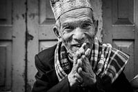 Zwart wit portretfotografie van een Nepalese man. Ik kwam deze man tegen, zittende voor een mooie turquoise deur, in de straten van Kathmandu. Zijn vriendelijke gezicht en verrimpelde handen trokken mijn aandacht.