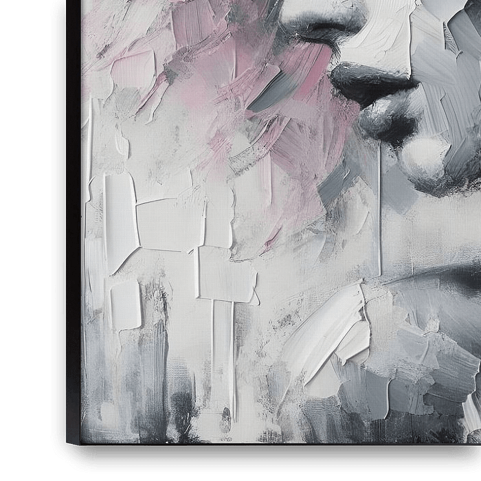 Ontdek de rauwe schoonheid van deze uitgevoerde zwart-wit olieverfschildering met subtiele roze tinten, waar de krachtige penseelstreken een unieke dimensie toevoegen aan het vrouwenportret. Dit kunstwerk ademt expressie en karakter, waardoor elke ruimte doordrenkt wordt met een ongepolijste, authentieke sfeer.
