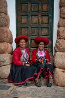 Portret van 2 Peruaanse vrouwen gekleed in traditionele kleding, zittend voor een blauw groene deur zitten. Deze foto is genomen in het traditionele dorpje Chinchero, dichtbij Cusco, Peru in Zuid-Amerika.