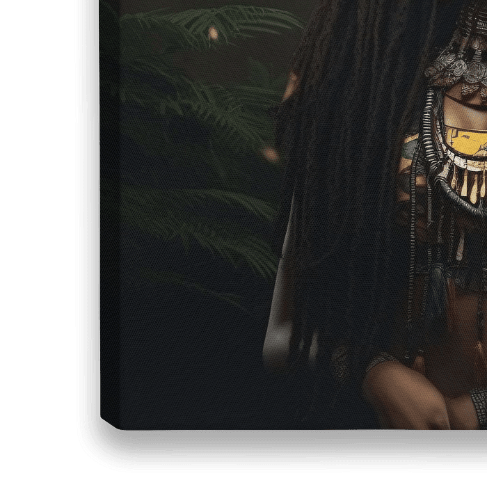 Ervaar de harmonieuze connectie tussen een Afrikaanse vrouw en een leeuw uit haar tribale rijk. Dit schilderij vangt haar onverschrokken geest terwijl ze kracht belichaamt voor haar volk.
