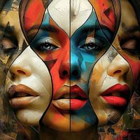 Fascinerende fusie van drie verschillende vrouwelijke gezichten, elk afgebeeld met unieke kleurstellingen en patronen, samengevoegd tot een symmetrische compositie. De krachtige lijnen die de gezichten scheiden, creëren een gevoel van zowel verbinding als scheiding tussen de verschillende entiteiten. De textuur en het kleurenpalet, dat…