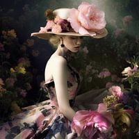 Portret "Take me to wonderland". Modern portret met een zachte, sfeervolle uitstraling. Een vrouw met een grote hoed en prachtige bloemenjurk bevindt zich tussen de roze bloemen. Een bijzonder werk voor aan je muur!