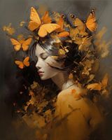 Portret "Take me to wonderland". Kleurrijk portret in warme tinten van een jonge vrouw, omringd door vlinders. Een bijzonder werk voor aan je muur! Mooi in ieder formaat en op elk materiaal.