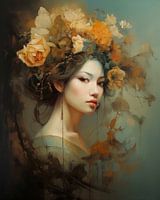 Portret "Take me to wonderland". Kleurrijk portret in warme tinten van een jonge vrouw, omringd door vlinders. Een bijzonder werk voor aan je muur! Mooi in ieder formaat en op elk materiaal.