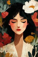 Een portret in warme, expressieve kleuren toont een sereen moment van contemplatie. De compositie wordt omlijst door weelderige bloemen in rood, oranje en wit die contrasteren met het donkere haar. De zachte penseelstreken en het kleurgebruik creëren een dromerige, poëtische sfeer die doet denken aan moderne Aziatische kunstinvloeden.