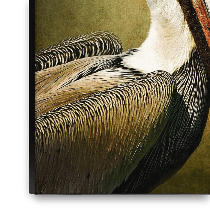 Portretfoto van een kleurige pelikaan op digitaal geschilderde achtergrond met mooie oranje en groene kleuren. Pelikanen behoren tot de grootste vliegende vogels en kunnen wel 1,80 meter lang worden, met een spanwijdte van 3 meter.