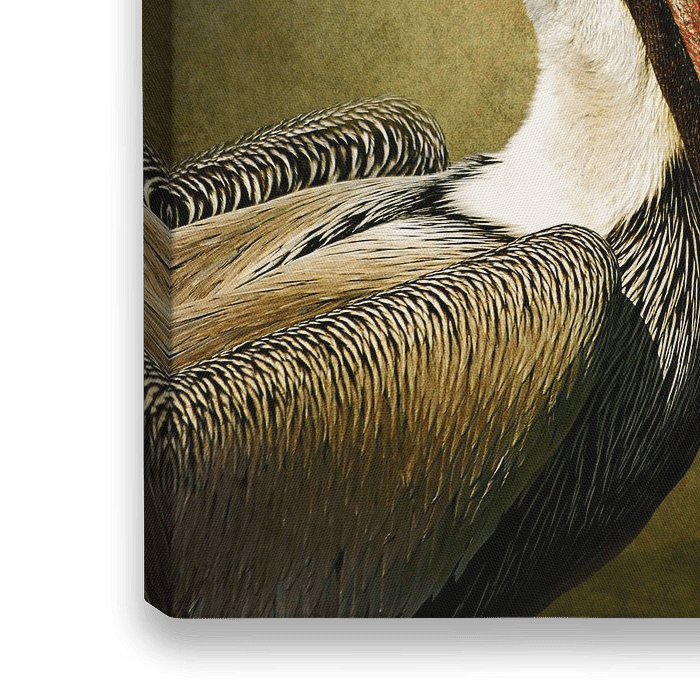 Portretfoto van een kleurige pelikaan op digitaal geschilderde achtergrond met mooie oranje en groene kleuren. Pelikanen behoren tot de grootste vliegende vogels en kunnen wel 1,80 meter lang worden, met een spanwijdte van 3 meter.