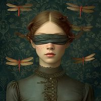 Details: vrouw, libellen, surrealistisch, portret, floraal, groen, goud, geblindeerd, mysterieus, elegant