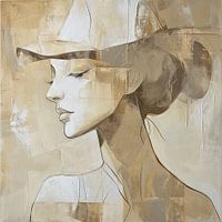 Portret Vrouw met Hoed - Op schilderij prijkt een gestileerd vrouwelijk portret in een palet van gouden en aardse tinten, waarbij de serene uitdrukking en het speelse lijnenspel een moderne chique uitstraling aan dit kunstwerk geven. De subtiele mix van textures en de abstracte vormen in de achtergrond creëren een elegant en intrigerend geheel dat blijft boeien.