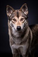 Portret foto van een Tamaskan Wolfshond tegen een donkere navy blauwe / zwarte achtergrond. Met de uitstraling van een wolf geeft deze hond een prachtige blik op de foto.