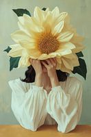 Een etherisch beeld waarin een persoon in een luchtige witte blouse de eigen identiteit verbergt achter een grote, romige zonnebloem. Het contrast tussen de zachte, gebroken witte tinten van de kleding en de warme goudgele bloem creëert een dromerige, bijna surrealistische sfeer. De compositie straalt tegelijk kracht en kwetsbaarheid uit, waarbij natuur en mens versmelten tot één poëtisch geheel.
