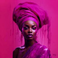 Het digitale portret van de Afrikaanse vrouw in prachtige magenta tinten is een opvallend beeld dat evenveel vertelt over kracht als over schoonheid. Haar donkere huid lijkt te gloeien in de warme tonen, die een levendig contrast creëren met de intense magenta achtergrond. De sterke, zelfverzekerde blik in haar ogen en de trotse houding…