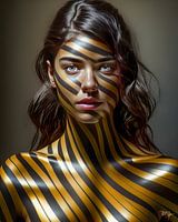 Het portret toont de vrouwelijke vormen in speelse en unieke gouden vormen en lijnen, die een gevoel van luxe en elegantie uitstralen. De details zijn vaak subtiel, maar toch opvallend genoeg om de aandacht te trekken.