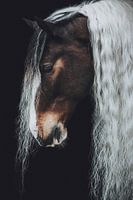 Fine art portret van bont gevlekt paard en profile. Deze foto is van de zijkant genomen en geeft de belijning in het gezicht van dit paard mooi weer. Ook zijn de lange helderwitte manen mooi zichtbaar en door de zwarte achtergrond komt dit paard mooi naar voren. Een mooie beeldvullende foto met een bijzondere compositie doordat de foto van de zijkant is genomen. Een mooi kunstwerk voor aan iedere muur en prachtig te combineren met de andere foto’s uit deze serie.