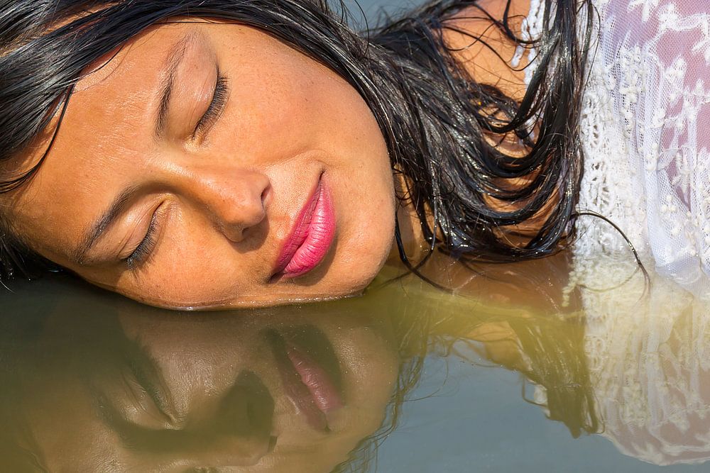Portret gezicht van jonge colombiaanse vrouw met reflectie in natuurlijk water. De vrouwelijke persoon ligt met haar hoofd op het water. Ze heeft de ogen dicht en het lijkt alsof ze geniet en dagdroomt.