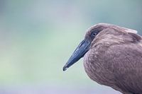 Portret van een hamerkop gefotografeerd in Zuid-Afrika. Een grappige vogel met een sprekende kop, bruin verenkleed en een lange, platte snavel.