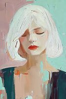 Een modern digitaal portret in zachte pasteltinten van mint, koraal en roze, met expressieve penseelstreken die een serene sfeer creëren. Het contrast tussen het witte haar en de felrode lippen vormt een krachtig focuspunt in deze minimalistische maar emotioneel geladen compositie.