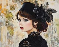 Portret in Zwart en Goud - Dit vrouwenportret schilderij toont een elegante jonge vrouw met een zwarte hoed verfraaid met bloemen en veren, gekleed in een zwarte kanten outfit tegen een licht versleten achtergrond met vage bloemmotieven.