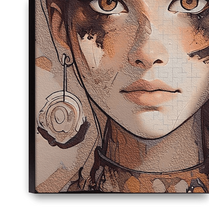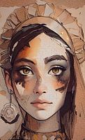 Een portret van een jonge vrouw in roest bruine tinten. Dit werk is gemaakt op basis van een mixed media kunstwerk. Met hulp van ai is dit werk omgezet in een werk met koffie kleuren, mokka, bruin, bruinzwart en karamel.