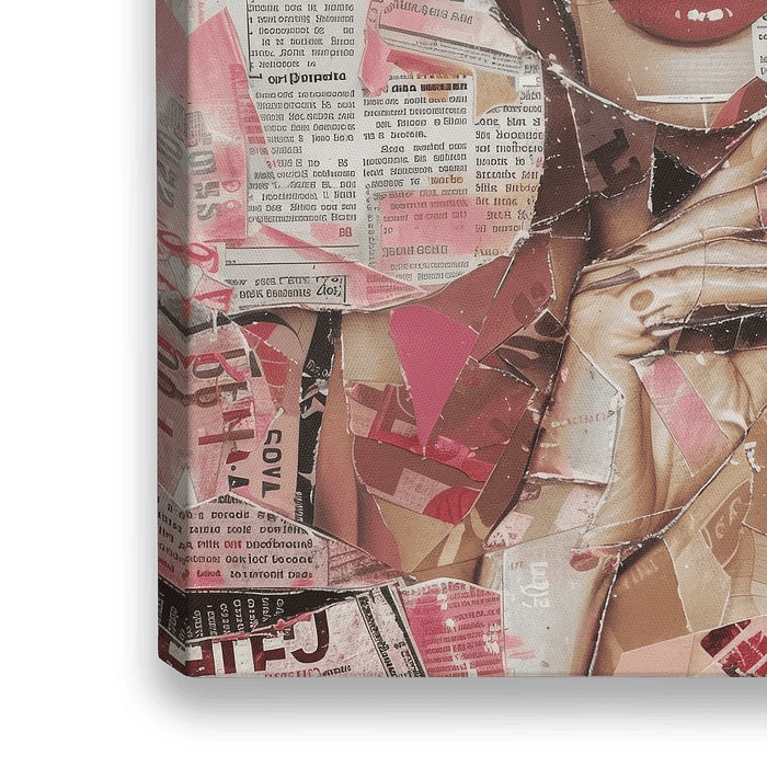 Portret in collage stijl, in roze tinten. Kies jij voor dit kleurrijke portret in popart en collage stijl? Met dit werk haal je een bijzondere blikvanger in huis.
