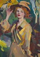 Een olieverfschilderij van een portret van een elegante vrouw in de stijl van Henri Matisse, met zichtbare penseelstreken, canvasstructuur en penseelstrepen. Het schilderij heeft paletmes-texturen, een kleurrijke achtergrond, een zonnehoed, een gele jurk, groen gebladerte, een buitenscène, groen en een zonovergoten, impressionistische, vintage, art deco geïnspireerde stijl met rijke kleuren.