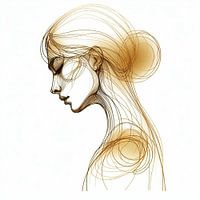 Een digitaal gemaakte lijntekening van een portret van een vrouw. De zwarte lijnen zwieren om haar gezicht en hals en gouden schouder en gouden haar.